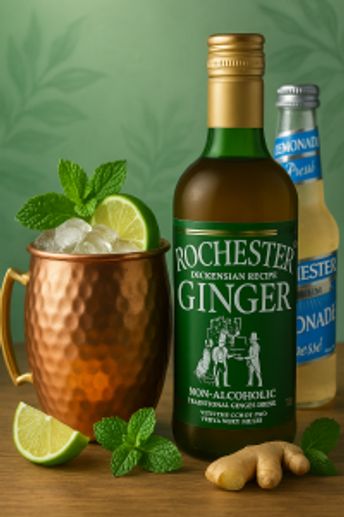 Fill small tankard with ice, add 1 part of vodka, 2 parts of Rochester Ginger and 2 parts of Premium Lemonade (or similar). Garnish with a slice of lime and mint leaves.