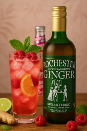Fill the glass with ice, add 1 part of Rochester Ginger, 2 parts of Cranberry and Raspberry pressé (or similar). Garnish with mint leaves and fresh raspberries.